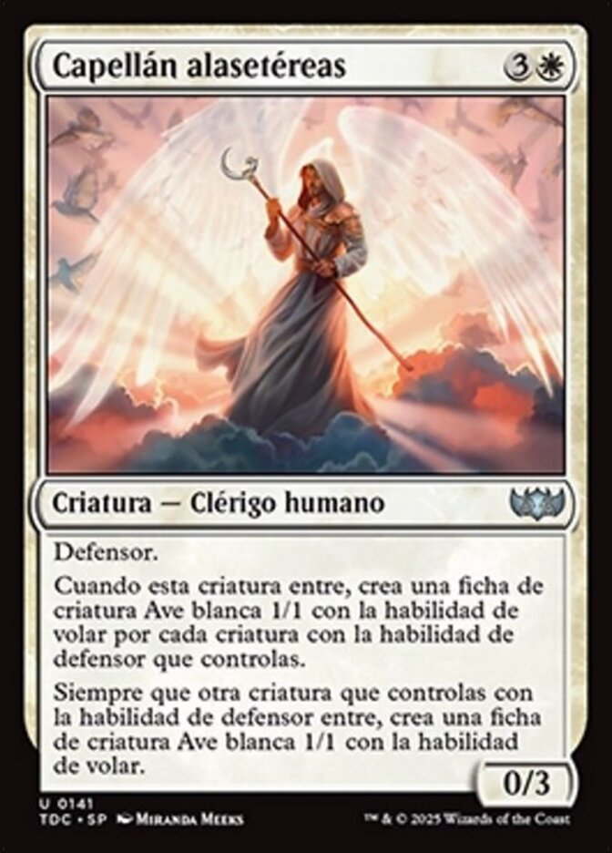 | Rules | Defender When Wingmantle Chaplain enters the battlefield, create a 1/1 white Bird creature token with flying for each creature with defender you control. Whenever another creature with defender enters the battlefield under your control, create a 1/1 white Bird creature token with flying. |