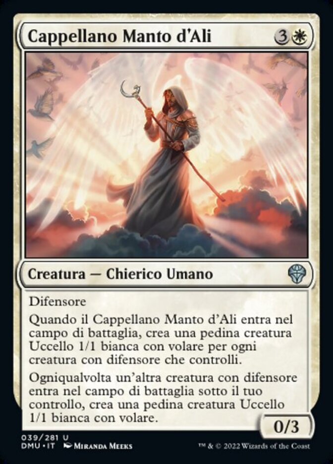 | Rules | Defender When Wingmantle Chaplain enters the battlefield, create a 1/1 white Bird creature token with flying for each creature with defender you control. Whenever another creature with defender enters the battlefield under your control, create a 1/1 white Bird creature token with flying. |