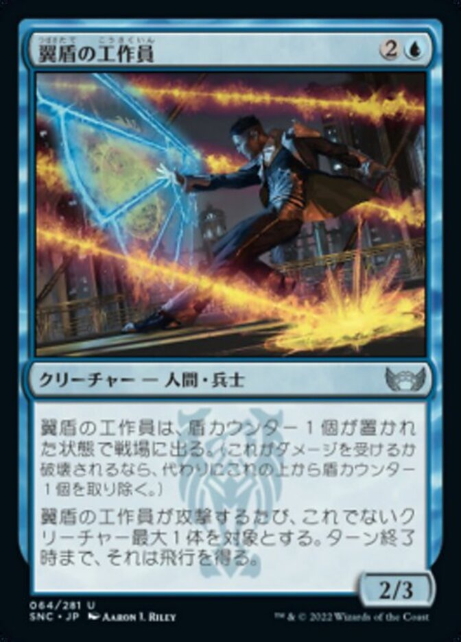 | Rules | Wingshield Agent enters the battlefield with a shield counter on it. (If it would be dealt damage or destroyed, remove a shield counter from it instead.) Whenever Wingshield Agent attacks, up to one other target creature gains flying until end of turn. |
