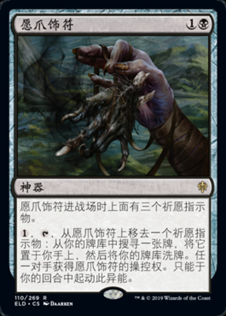 | Rules | Wishclaw Talisman enters the battlefield with three wish counters on it. , , Remove a wish counter from Wishclaw Talisman: Search your library for a card, put it into your hand, then shuffle. An opponent gains control of Wishclaw Talisman. Activate only during your turn. |