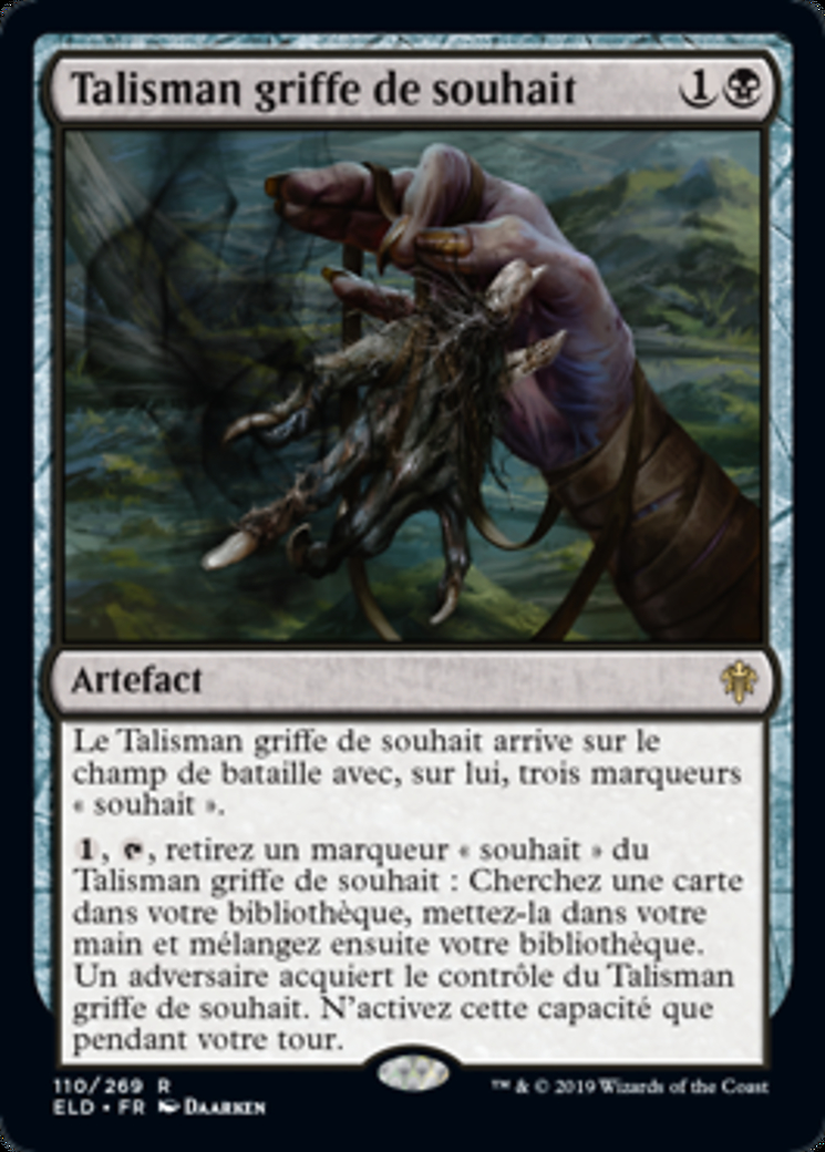 | Rules | Wishclaw Talisman enters the battlefield with three wish counters on it. , , Remove a wish counter from Wishclaw Talisman: Search your library for a card, put it into your hand, then shuffle. An opponent gains control of Wishclaw Talisman. Activate only during your turn. |