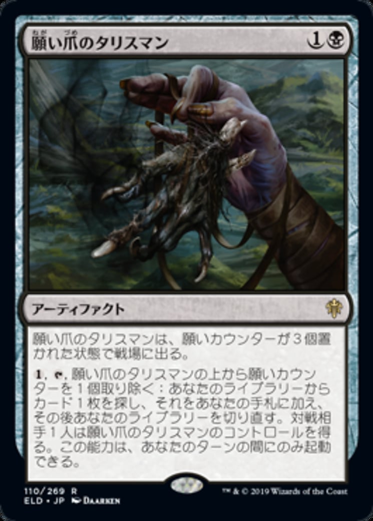 | Rules | Wishclaw Talisman enters the battlefield with three wish counters on it. , , Remove a wish counter from Wishclaw Talisman: Search your library for a card, put it into your hand, then shuffle. An opponent gains control of Wishclaw Talisman. Activate only during your turn. |