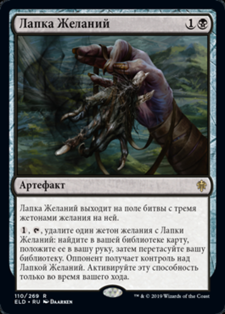 | Rules | Wishclaw Talisman enters the battlefield with three wish counters on it. , , Remove a wish counter from Wishclaw Talisman: Search your library for a card, put it into your hand, then shuffle. An opponent gains control of Wishclaw Talisman. Activate only during your turn. |