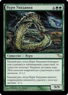 | Rules | Whenever Witherscale Wurm blocks or becomes blocked by a creature, that creature gains wither until end of turn. (It deals damage to creatures in the form of -1/-1 counters.) Whenever Witherscale Wurm deals damage to an opponent, remove all -1/-1 counters from it. |