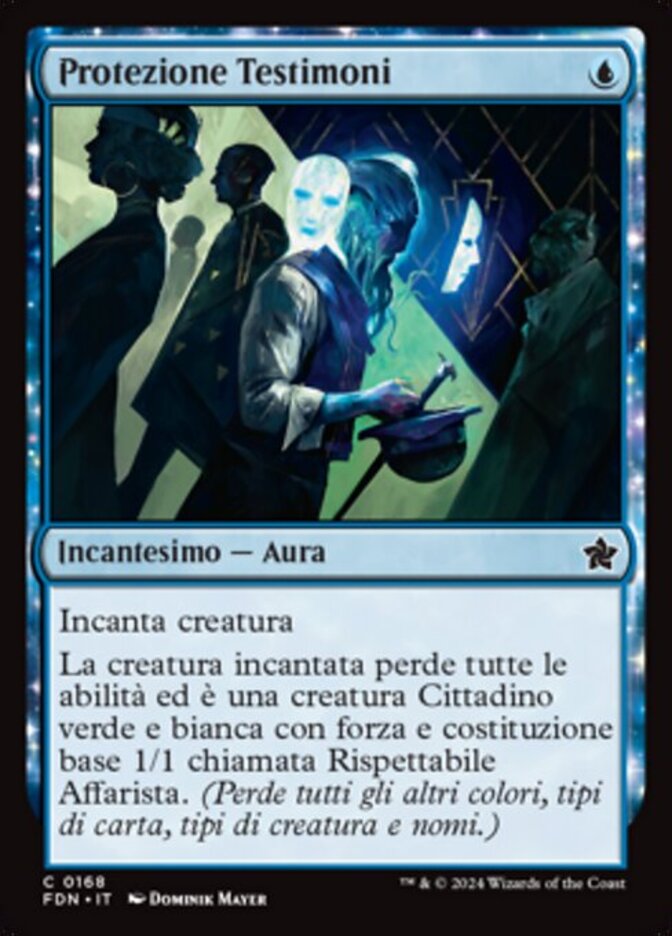 | Rules | Enchant creature Enchanted creature loses all abilities and is a green and white Citizen creature with base power and toughness 1/1 named Legitimate Businessperson. (It loses all other colors, card types, creature types, and names.) |