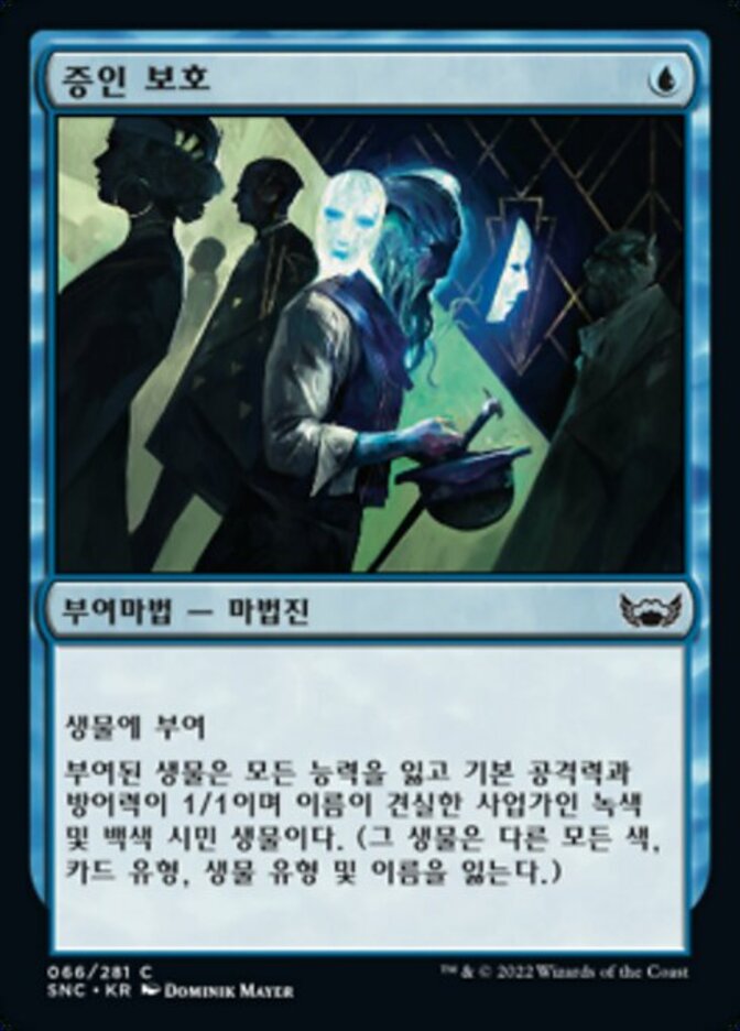| Rules | Enchant creature Enchanted creature loses all abilities and is a green and white Citizen creature with base power and toughness 1/1 named Legitimate Businessperson. (It loses all other colors, card types, creature types, and names.) |