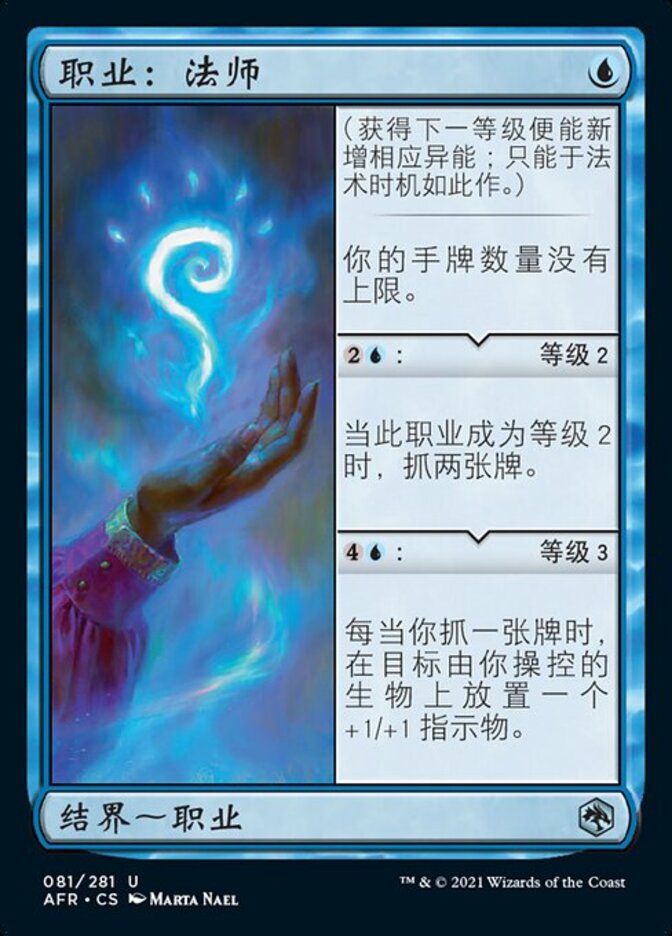 | Rules | (Gain the next level as a sorcery to add its ability.) You have no maximum hand size. : Level 2 When this Class becomes level 2, draw two cards. : Level 3 Whenever you draw a card, put a +1/+1 counter on target creature you control. |