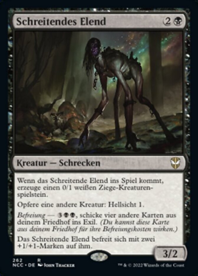 | Rules | When Woe Strider enters the battlefield, create a 0/1 white Goat creature token. Sacrifice another creature: Scry 1. Escape—, Exile four other cards from your graveyard. (You may cast this card from your graveyard for its escape cost.) Woe Strider escapes with two +1/+1 counters on it. |