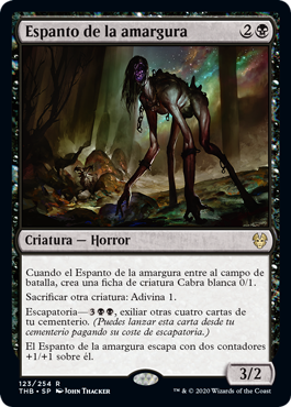 | Rules | When Woe Strider enters the battlefield, create a 0/1 white Goat creature token. Sacrifice another creature: Scry 1. Escape—, Exile four other cards from your graveyard. (You may cast this card from your graveyard for its escape cost.) Woe Strider escapes with two +1/+1 counters on it. |