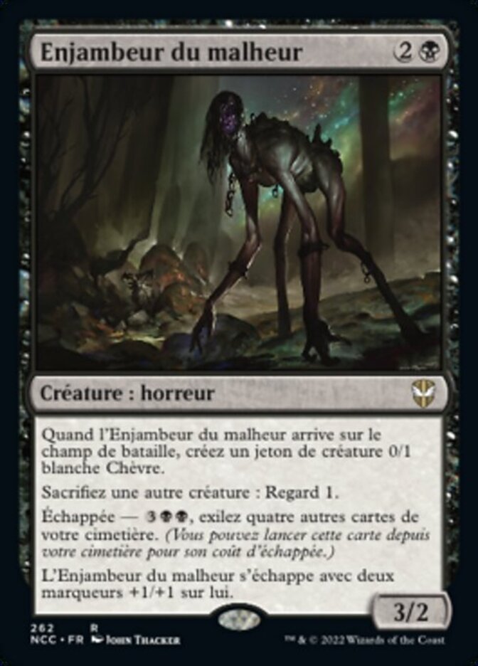 | Rules | When Woe Strider enters the battlefield, create a 0/1 white Goat creature token. Sacrifice another creature: Scry 1. Escape—, Exile four other cards from your graveyard. (You may cast this card from your graveyard for its escape cost.) Woe Strider escapes with two +1/+1 counters on it. |