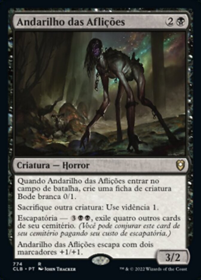 | Rules | When Woe Strider enters the battlefield, create a 0/1 white Goat creature token. Sacrifice another creature: Scry 1. Escape—, Exile four other cards from your graveyard. (You may cast this card from your graveyard for its escape cost.) Woe Strider escapes with two +1/+1 counters on it. |