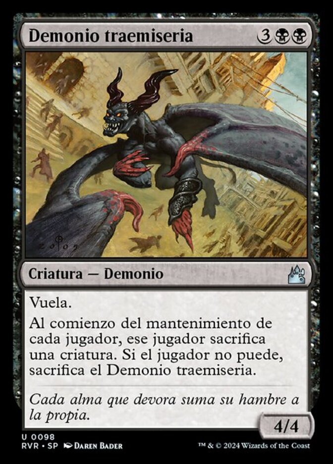 | Rules | Flying At the beginning of each player's upkeep, that player sacrifices a creature. If the player can't, sacrifice Woebringer Demon. |