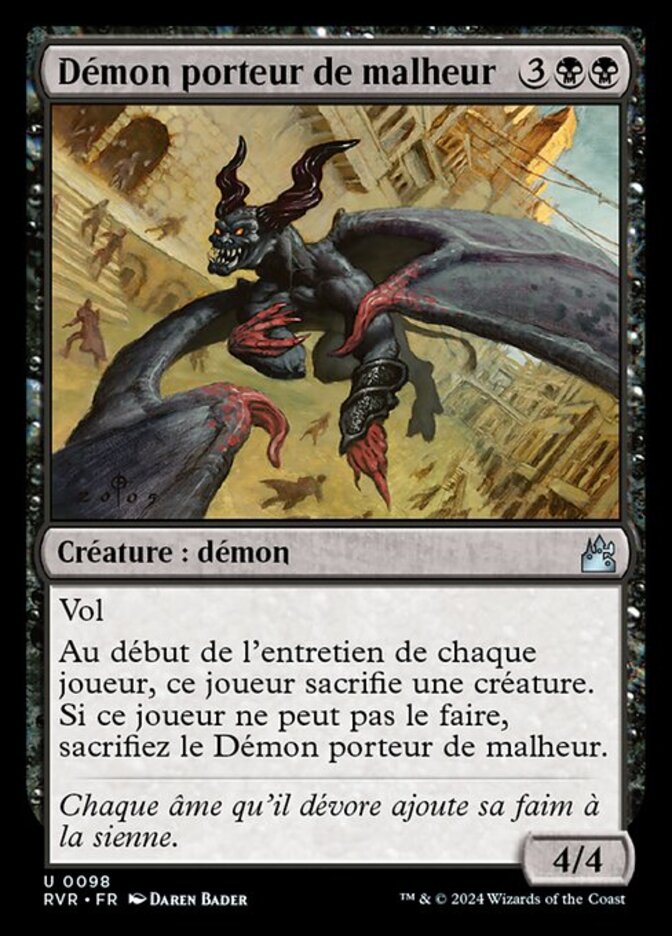 | Rules | Flying At the beginning of each player's upkeep, that player sacrifices a creature. If the player can't, sacrifice Woebringer Demon. |