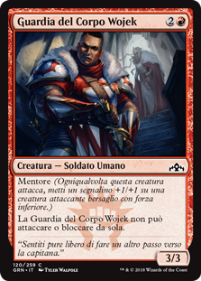 | Rules | Mentor (Whenever this creature attacks, put a +1/+1 counter on target attacking creature with lesser power.) Wojek Bodyguard can't attack or block alone. |