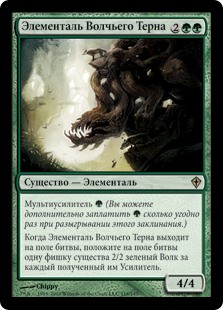 | Rules | Multikicker (You may pay an additional any number of times as you cast this spell.) When Wolfbriar Elemental enters the battlefield, create a 2/2 green Wolf creature token for each time it was kicked. |