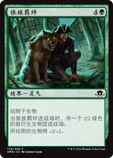 | Rules | Enchant creature When Wolfkin Bond enters the battlefield, create a 2/2 green Wolf creature token. Enchanted creature gets +2/+2. |