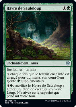 | Rules | Enchant land Whenever enchanted land is tapped for mana, its controller adds an additional . , Sacrifice Wolfwillow Haven: Create a 2/2 green Wolf creature token. Activate only during your turn. |