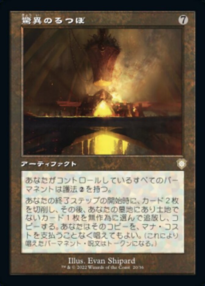 | Rules | Permanents you control have ward . At the beginning of your end step, mill two cards, then exile a nonland card at random from your graveyard. Copy it. You may cast the copy without paying its mana cost. (A copy of a permanent spell becomes a token.) |