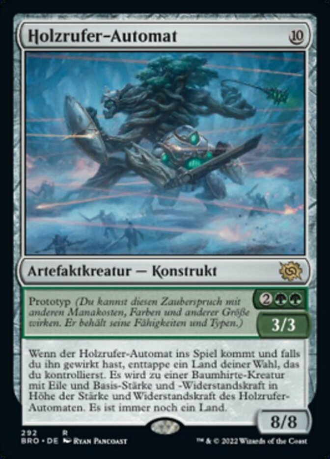 | Rules | Prototype — 3/3 (You may cast this spell with different mana cost, color, and size. It keeps its abilities and types.) When Woodcaller Automaton enters the battlefield, if you cast it, untap target land you control. It becomes a Treefolk creature with haste and base power and toughness equal to Woodcaller Automaton's power and toughness. It's still a land. |
