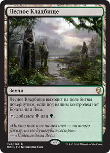 | Rules | Woodland Cemetery enters the battlefield tapped unless you control a Swamp or a Forest. : Add or . |