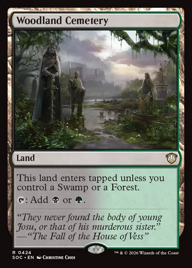 | Rules | Woodland Cemetery enters the battlefield tapped unless you control a Swamp or a Forest. : Add or . |
