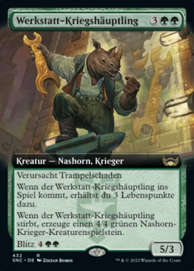 | Rules | Trample When Workshop Warchief enters the battlefield, you gain 3 life. When Workshop Warchief dies, create a 4/4 green Rhino Warrior creature token. Blitz (If you cast this spell for its blitz cost, it gains haste and "When this creature dies, draw a card." Sacrifice it at the beginning of the next end step.) |