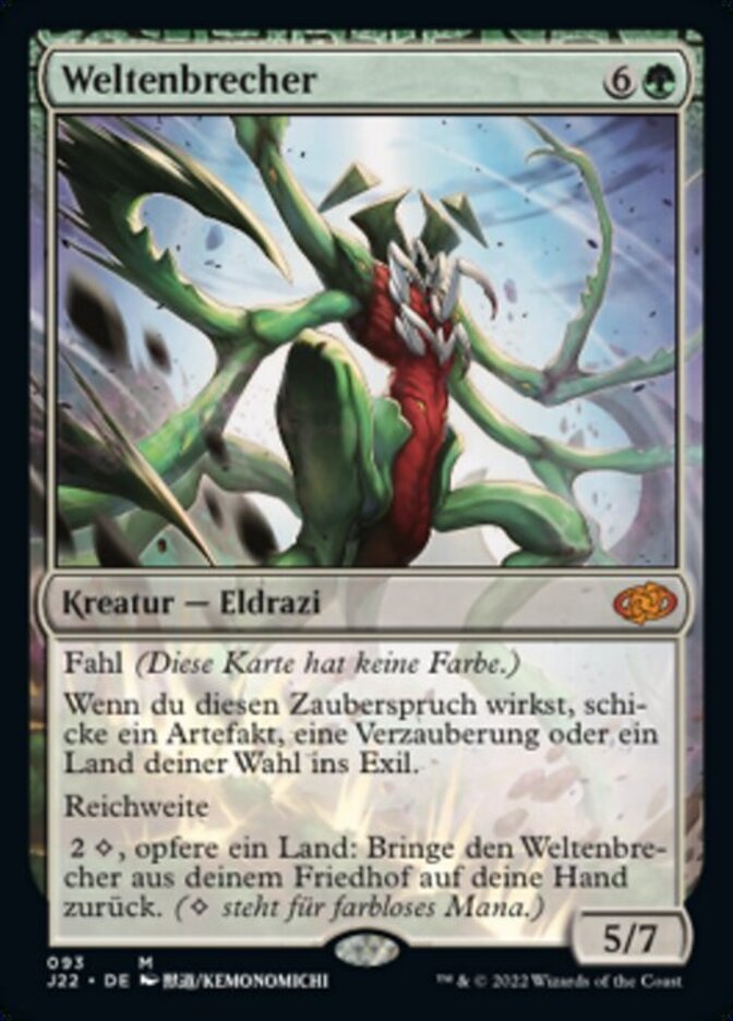 | Rules | Devoid (This card has no color.) When you cast this spell, exile target artifact, enchantment, or land. Reach , Sacrifice a land: Return World Breaker from your graveyard to your hand. ( represents colorless mana.) |