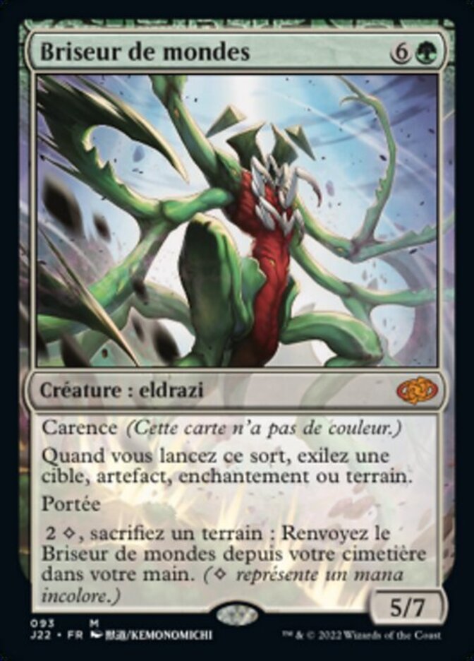 | Rules | Devoid (This card has no color.) When you cast this spell, exile target artifact, enchantment, or land. Reach , Sacrifice a land: Return World Breaker from your graveyard to your hand. ( represents colorless mana.) |
