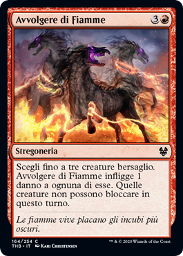 | Rules | Wrap in Flames deals 1 damage to each of up to three target creatures. Those creatures can't block this turn. |
