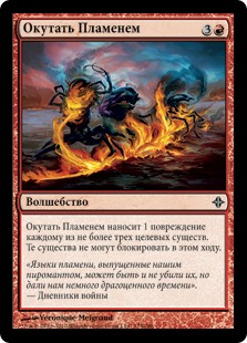 | Rules | Wrap in Flames deals 1 damage to each of up to three target creatures. Those creatures can't block this turn. |