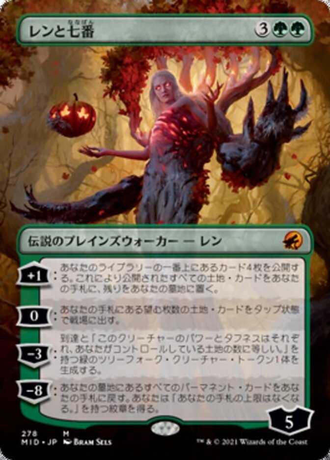 | Rules | +1: Reveal the top four cards of your library. Put all land cards revealed this way into your hand and the rest into your graveyard. 0: Put any number of land cards from your hand onto the battlefield tapped. −3: Create a green Treefolk creature token with reach and "This creature's power and toughness are each equal to the number of lands you control." −8: Return all permanent cards from your graveyard to your hand. You get an emblem with "You have no maximum hand size." |