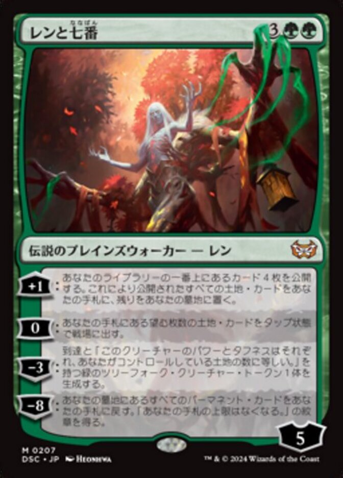 | Rules | +1: Reveal the top four cards of your library. Put all land cards revealed this way into your hand and the rest into your graveyard. 0: Put any number of land cards from your hand onto the battlefield tapped. −3: Create a green Treefolk creature token with reach and "This creature's power and toughness are each equal to the number of lands you control." −8: Return all permanent cards from your graveyard to your hand. You get an emblem with "You have no maximum hand size." |