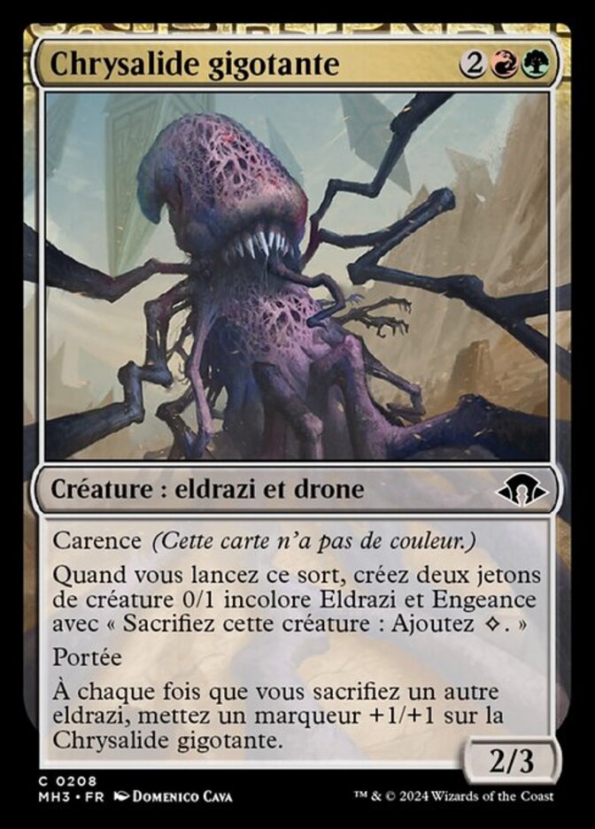 | Rules | Devoid (This card has no color.) When you cast this spell, create two 0/1 colorless Eldrazi Spawn creature tokens with "Sacrifice this creature: Add ." Reach Whenever you sacrifice another Eldrazi, put a +1/+1 counter on Writhing Chrysalis. |