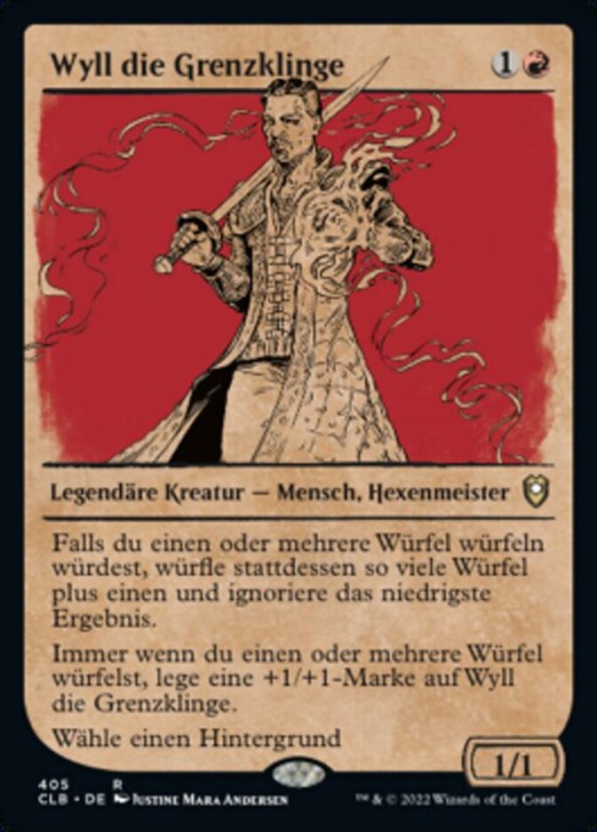 | Rules | If you would roll one or more dice, instead roll that many dice plus one and ignore the lowest roll. Whenever you roll one or more dice, put a +1/+1 counter on Wyll, Blade of Frontiers. Choose a Background (You can have a Background as a second commander.) |
