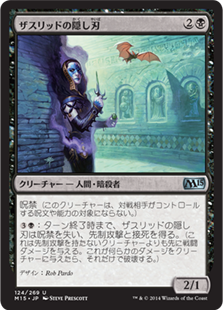 | Rules | Hexproof (This creature can't be the target of spells or abilities your opponents control.) : Until end of turn, Xathrid Slyblade loses hexproof and gains first strike and deathtouch. (It deals combat damage before creatures without first strike. Any amount of damage it deals to a creature is enough to destroy it.) |