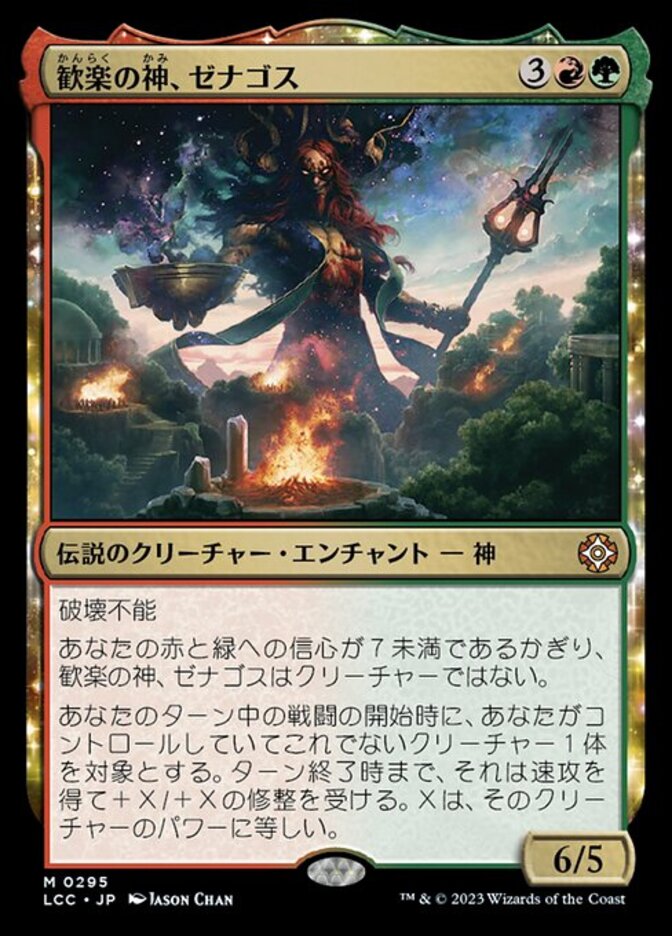 | Rules | Indestructible As long as your devotion to red and green is less than seven, Xenagos isn't a creature. At the beginning of combat on your turn, another target creature you control gains haste and gets +X/+X until end of turn, where X is that creature's power. |