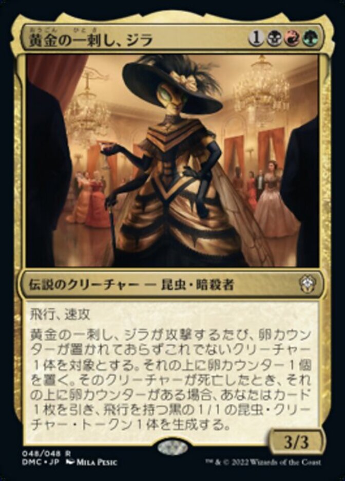 | Rules | Flying, haste Whenever Xira, the Golden Sting attacks, put an egg counter on another target creature without an egg counter on it. When that creature dies, if it has an egg counter on it, draw a card and create a 1/1 black Insect creature token with flying. |