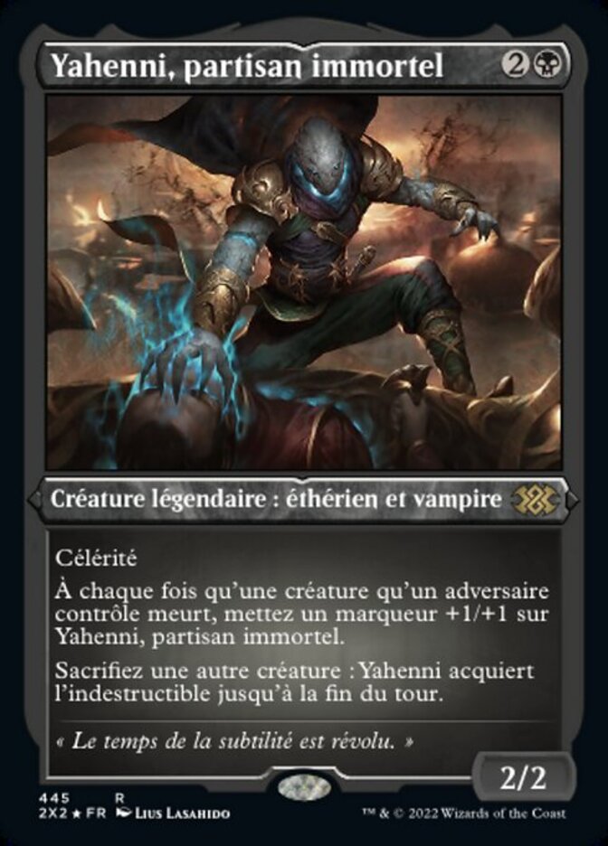 | Rules | Haste Whenever a creature an opponent controls dies, put a +1/+1 counter on Yahenni, Undying Partisan. Sacrifice another creature: Yahenni gains indestructible until end of turn. |
