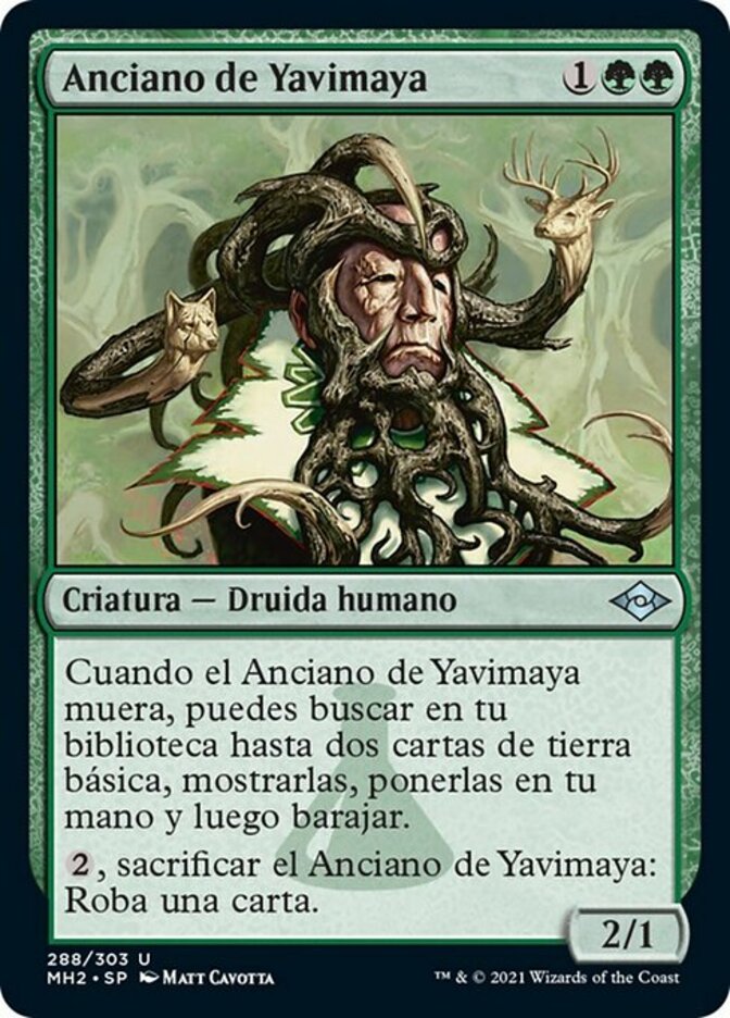 | Rules | When Yavimaya Elder dies, you may search your library for up to two basic land cards, reveal them, put them into your hand, then shuffle. , Sacrifice Yavimaya Elder: Draw a card. |