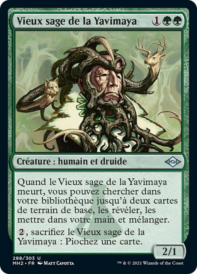 | Rules | When Yavimaya Elder dies, you may search your library for up to two basic land cards, reveal them, put them into your hand, then shuffle. , Sacrifice Yavimaya Elder: Draw a card. |