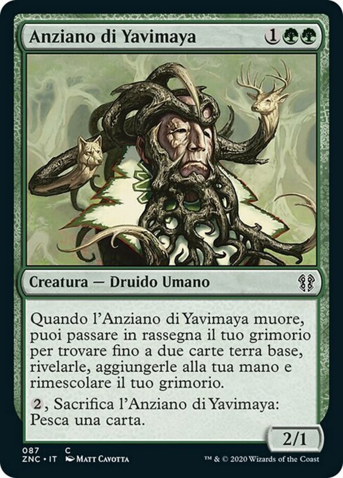 | Rules | When Yavimaya Elder dies, you may search your library for up to two basic land cards, reveal them, put them into your hand, then shuffle. , Sacrifice Yavimaya Elder: Draw a card. |