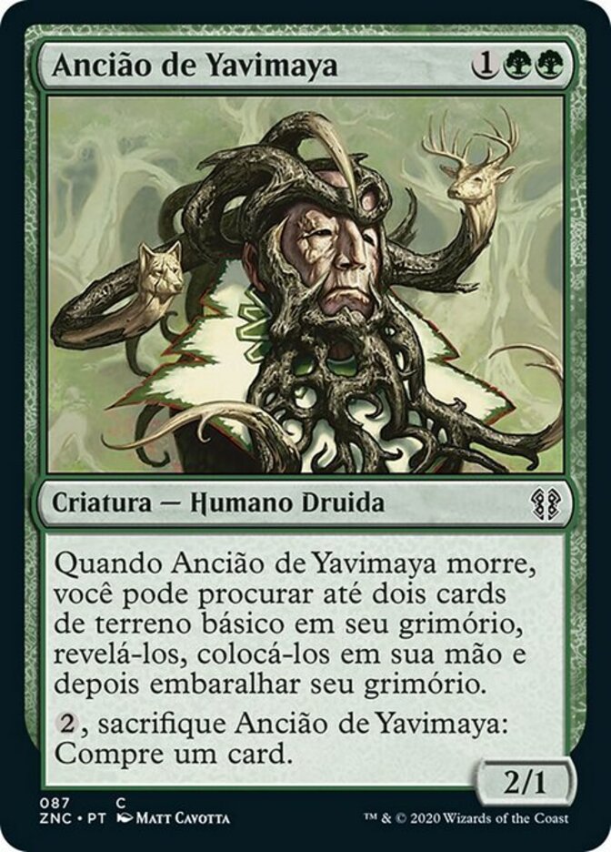 | Rules | When Yavimaya Elder dies, you may search your library for up to two basic land cards, reveal them, put them into your hand, then shuffle. , Sacrifice Yavimaya Elder: Draw a card. |