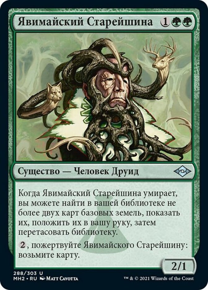| Rules | When Yavimaya Elder dies, you may search your library for up to two basic land cards, reveal them, put them into your hand, then shuffle. , Sacrifice Yavimaya Elder: Draw a card. |