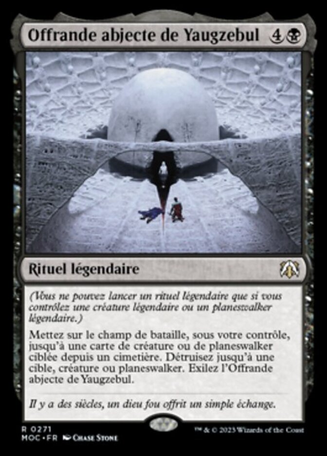 | Rules | (You may cast a legendary sorcery only if you control a legendary creature or planeswalker.) Put up to one target creature or planeswalker card from a graveyard onto the battlefield under your control. Destroy up to one target creature or planeswalker. Exile Yawgmoth's Vile Offering. |