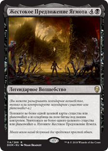 | Rules | (You may cast a legendary sorcery only if you control a legendary creature or planeswalker.) Put up to one target creature or planeswalker card from a graveyard onto the battlefield under your control. Destroy up to one target creature or planeswalker. Exile Yawgmoth's Vile Offering. |
