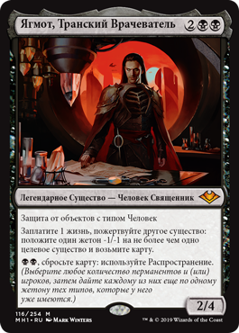 | Rules | Protection from Humans Pay 1 life, Sacrifice another creature: Put a -1/-1 counter on up to one target creature and draw a card. , Discard a card: Proliferate. (Choose any number of permanents and/or players, then give each another counter of each kind already there.) |
