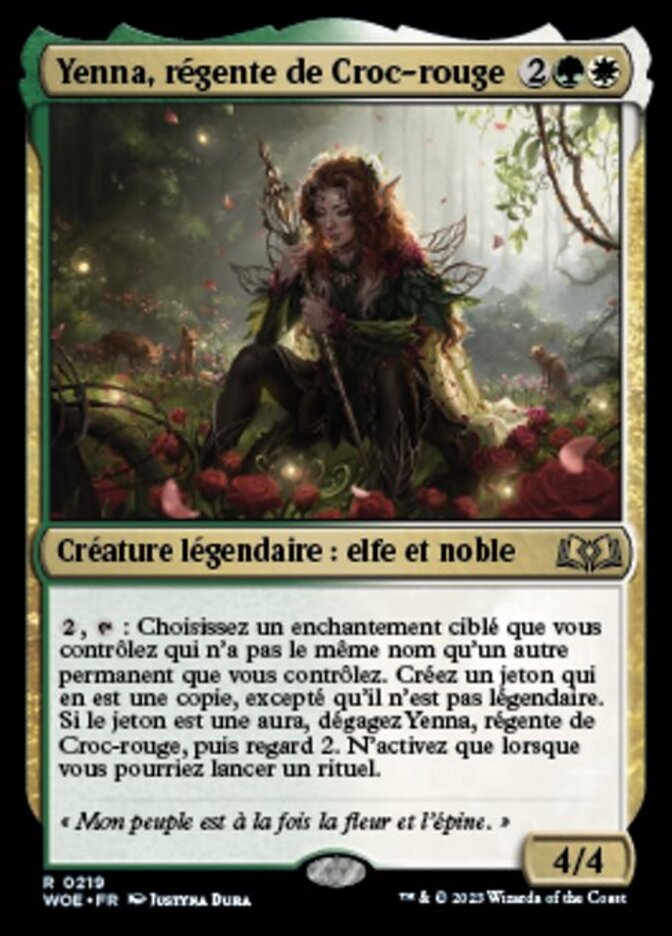 | Rules | , : Choose target enchantment you control that doesn't have the same name as another permanent you control. Create a token that's a copy of it, except it isn't legendary. If the token is an Aura, untap Yenna, Redtooth Regent, then scry 2. Activate only as a sorcery. |