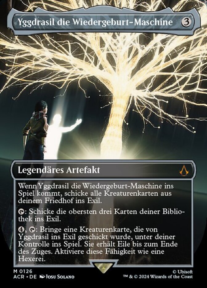 | Rules | When Yggdrasil, Rebirth Engine enters the battlefield, exile all creature cards from your graveyard. : Exile the top three cards of your library. , : Put a creature card exiled with Yggdrasil onto the battlefield under your control. It gains haste until end of turn. Activate only as a sorcery. |