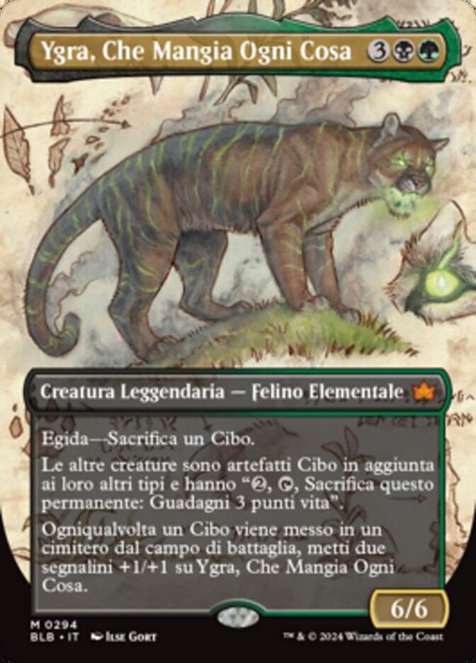 | Rules | Ward—Sacrifice a Food. Other creatures are Food artifacts in addition to their other types and have ", , Sacrifice this permanent: You gain 3 life." Whenever a Food is put into a graveyard from the battlefield, put two +1/+1 counters on Ygra, Eater of All. |