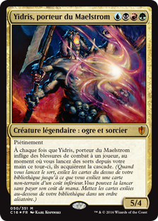 | Rules | Trample Whenever Yidris, Maelstrom Wielder deals combat damage to a player, as you cast spells from your hand this turn, they gain cascade. (When you cast the spell, exile cards from the top of your library until you exile a nonland card that costs less. You may cast it without paying its mana cost. Put the exiled cards on the bottom of your library in a random order.) |